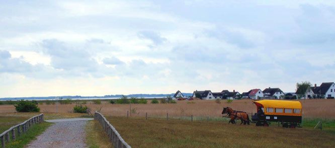 Ab und zu holt uns ein Pferdefuhrwerk ein, gezogen von schweren Mecklenburger Kaltblütern. In der Hochsaison chauffieren bis zu 70 Pferde die Besucher über Hiddensee. Die Insel ist autofrei. Nur der Arzt, der Inselpolizist und die Feuerwehr sind motorisiert.